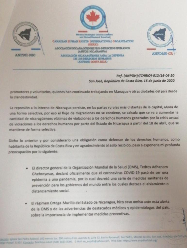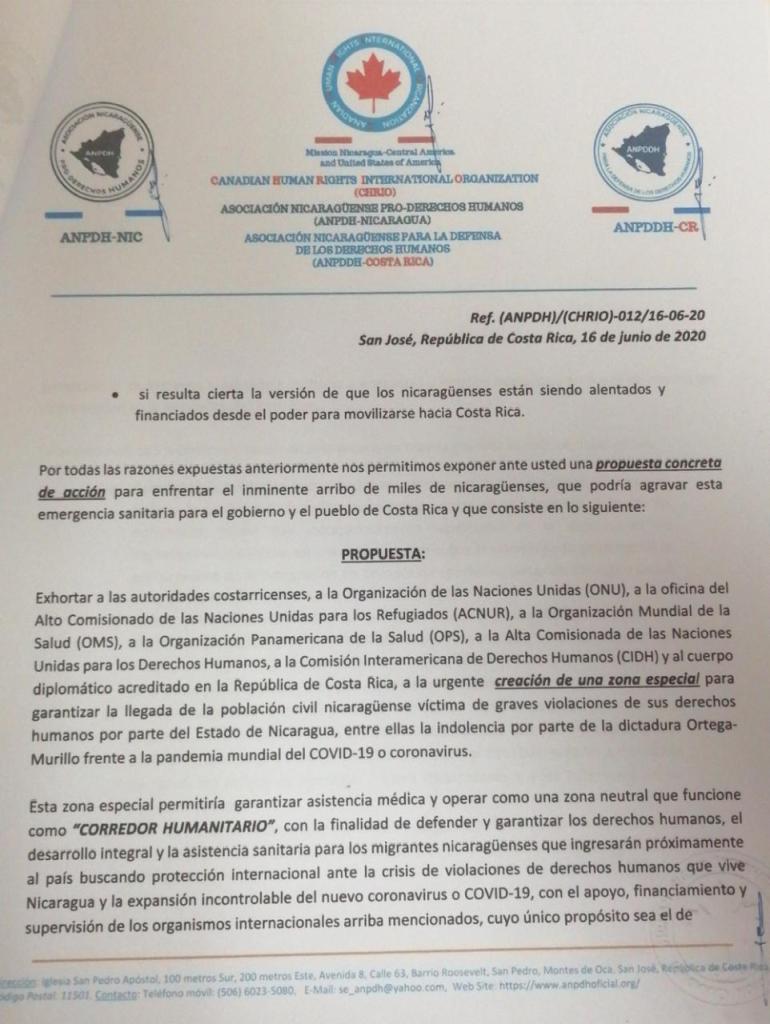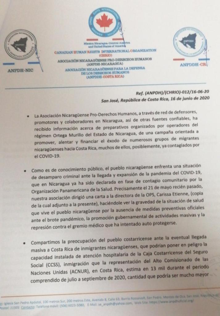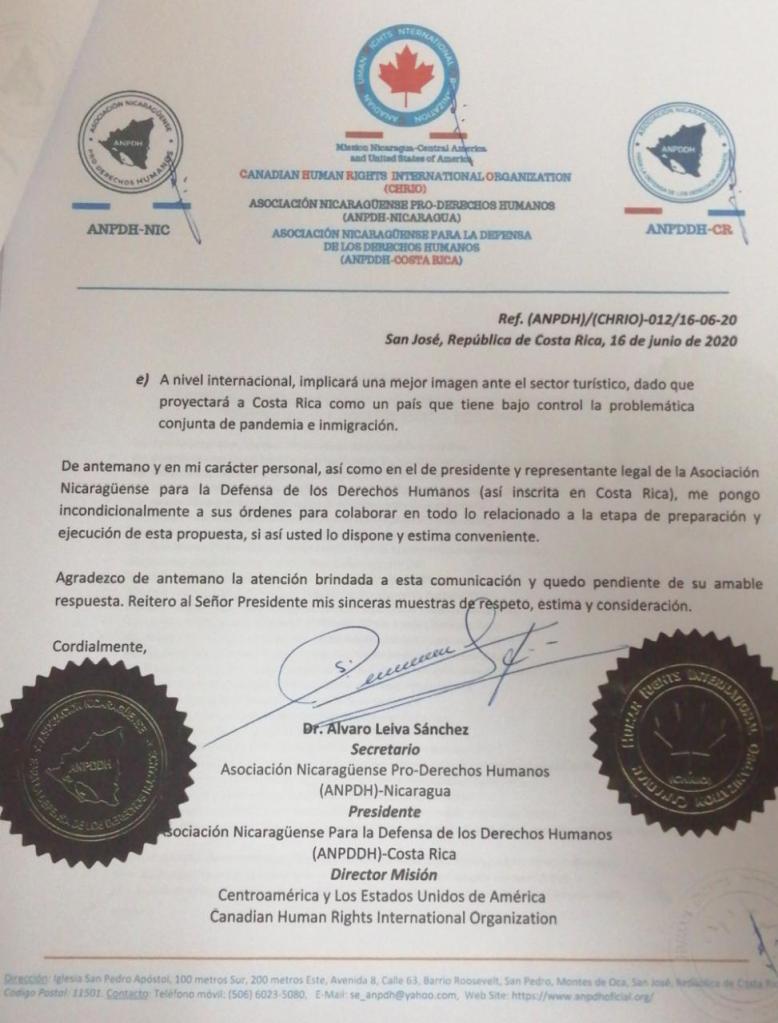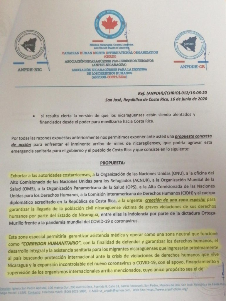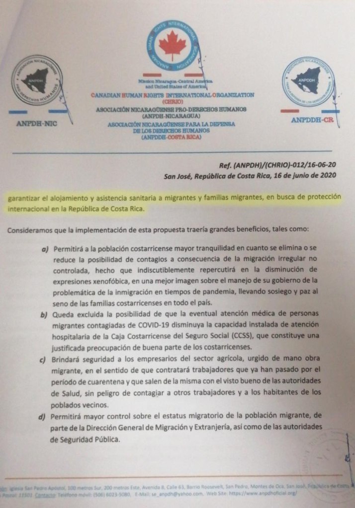 Y cómo si todo lo anteriormente dicho no fuera suficiente, hace pocos días (como lo pueden confirmar en esta extensa carta enviada al presidente Carlos Alvarado, pueden prestar atención especial a las partes subrayas en amarillo) el secretario de la Asociación Nicaragüense Pro Derechos Humanos (ANPDH) le solicita a Carlos Alvarado convertir a Costa Rica en una «Zona Especial Migratoria», lo que en sus propias palabras denomina: «Un Corredor Humanitario», en español: No olvidar los acuerdos pactados por Epsy Campbell en Marrakech, aunque eso sea una amenaza real para la salud del país. Pero recuerden, bien lo dijo el ministro de estadísticas diarias (anterioremente llamado jerarca de salud): Este NO es tiempo para ser «Xenofóbico».