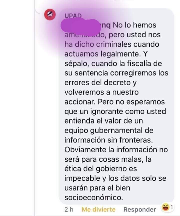 Ok, señores de la Upad vuelo directo a la NSA, siguen operando dado que responden y se tornan amenazantes, es decir los mismos que hicieron labores de espionaje a la Embajada de los Estados Unidos, cierto, bueno la jurisdicción de los Estados Unidos llega hasta donde llegan sus intereses, ( Destino Manifiesto) COMUNISTAS BARATOS Y COBARDES.