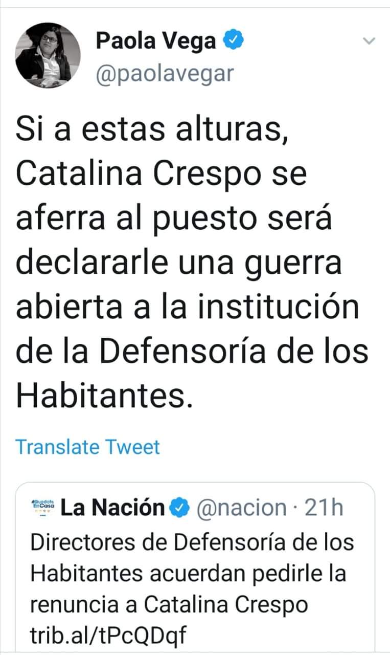 Los más éticos del país declarando la guerra y porqué no se la declaran también a la corrupción??, o acaso será porque es lo que más abunda en su partido PAC amoroso. Si bien es cierto la Cata Crespo tiene su enorme cuota corruptiva, ahora ustedes con sus tácticas de guerra solo buscan salvar al #CarebarroCR….que peligrosas se leen sus letras señorite diputade, se le salió lo izquierdista bolivariana!!!!