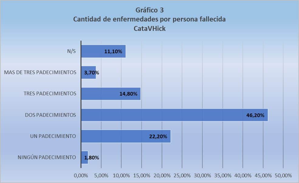 • En el gráfico 3 se muestra que por lo menos el 46.2% de los fallecidos tenían dos padecimientos de fondo y un 14.8% sufrían ya de tres enfermedades, así mismo un 22.2% tenían por lo menos una enfermedad diagnosticada.