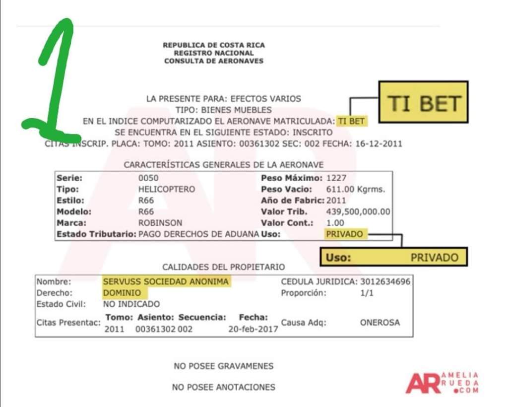 Y es que ha surgido muchísima información acerca de lo acontecido el fin de semana. Así las cosas, el día viernes se da el traslado desde San José hasta Nandayure en Guanacaste, en un helicóptero que está registrado a nombre de la empresa Servuss S.A de la cual André Garnier es socio, con matrícula TI-BET (imagen 1), esa aeronave no tiene permiso de funcionamiento por lo tanto no puede realizar actividad comercial y menos facturar. https://www.ameliarueda.com/nota/andre-garnier-cobro-presidente-viaje-helicoptero-sin-permiso-comercial