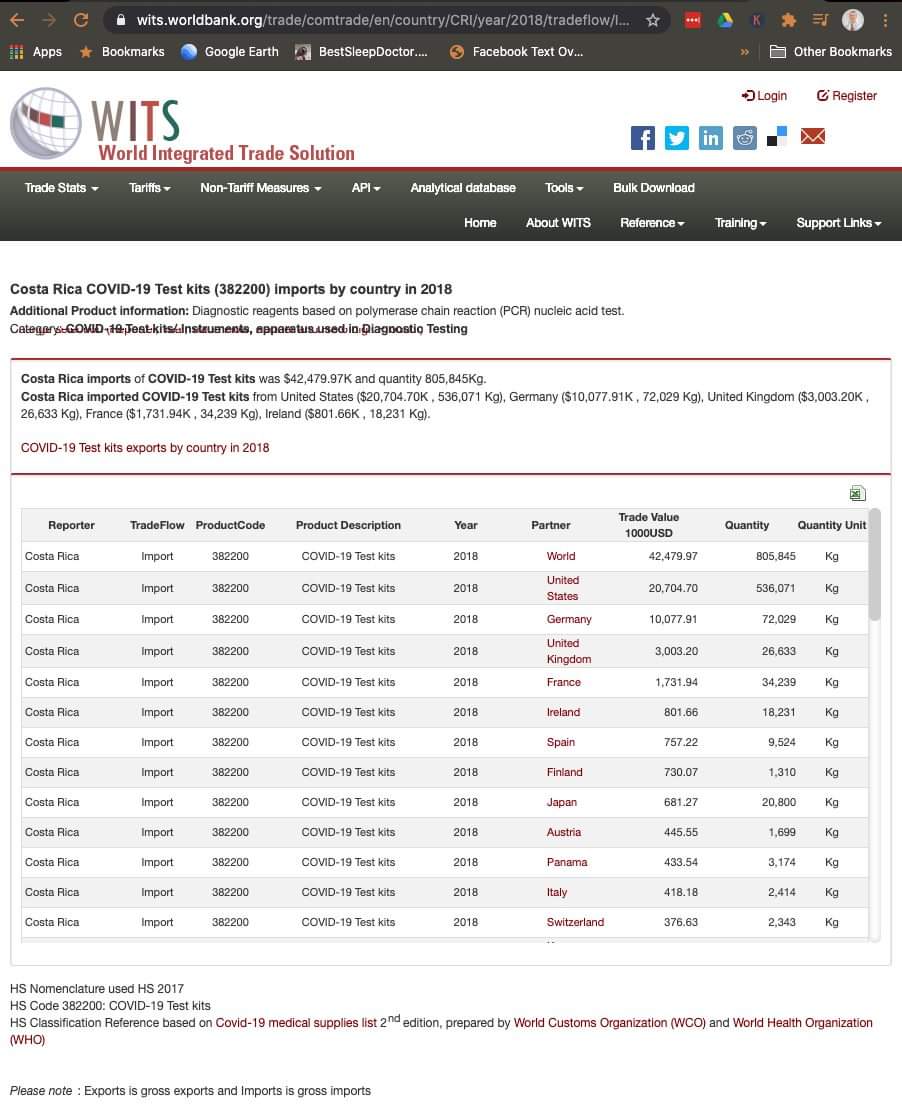El sitio World Integrated Trade Solution que es una plataforma adjunta al Banco Mundial donde exponen las compras que diversos países realizan – incluye a Costa Rica también- se logra observar datos interesantes de las compras de las pruebas PCR, realizadas desde el 2018, en el mismo se pueden ver los detalles específicos de las compras y los montos que se pagaron – lo adjunto en imágenes, también lo puede ver en el vídeo y en este link https://wits.worldbank.org/trade/comtrade/en/country/CRI/year/2018/tradeflow/Imports/partner/ALL/nomen/h5/product/382200
