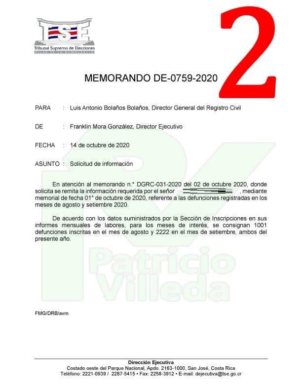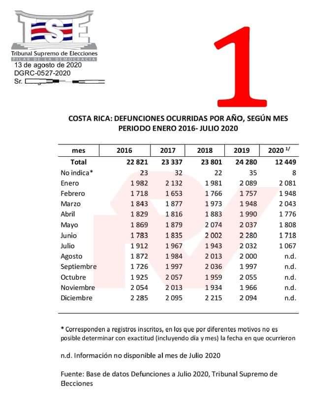 El día de ayer, recibimos la nota con oficio DE-759-2020, el TSE, donde nos informan que en agosto murieron 1001 personas, y en setiembre 2222, bueno bueno, fíjese usted… Resulta que los 8 primeros meses del 2016 murieron en Costa Rica 16543 personas, en el mismo período del 2017, murieron 17140 personas (597 más que el período anterior), en el mismo período del 2018, murieron 17171 personas (531 más que el año anterior), por su parte, en el 2019, en el mismo período, murieron 18130 personas, para contar un aumento de 459 personas con respecto al 2018, Y AHORA EN EL 2020, en el mismo período (de enero a setiembre), han muerto en Costa Rica 15664 personas, es decir 2466 personas MENOS que el período anterior… Nosotros le agradecemos infinitamente a Dios que sea tan bueno con nosotros (sí, Dios sí existe), pero con esto lo que pretendemos es evidenciar la GIGANTE mentira… Gracias a Dios (de nuevo) macaya y sus asustadores, se tendrán que meter las bolsas y los contenedores donde mejor le quepan…. POR JETONES !!!!!!!!!!!