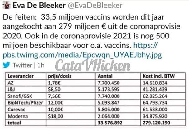 Hace unos días se filtraron los precios de las vacunas, eso fue gracias a un miembro del Gobierno de Bélgica, Eva De Bleeker, quien reveló una tabla (imagen adjunta) que revela que una de la$ vacuna$ má$ caras es la que ofrece la muy cuestionada farmacéutica Pfizer/BioNTech: $14,74 cada una. Esta funcionaria del gobierno Belga, hoy está siendo acosada por revelar datos “secretos” a la opinión pública…https://www.msn.com/es-es/noticias/internacional/se-filtran-los-precios-de-las-vacunas-contra-covid-19-en-europa-esto-es-lo-que-cuestan-las-candidatas-de-pfizer-moderna-oxford-y-johnson-johnson/ar-BB1c4kLz?ocid=ob-tw-eses-686&s=09