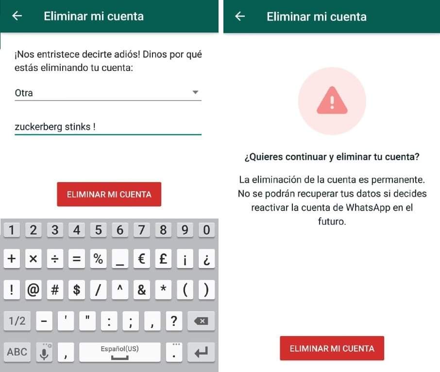 Para los que están en todas y hoy van a dejar atrás el whatsapp, le cuento que NO SOLO ES DESINSTALARLO, si solo lo desinstala igual le van a ver TODO, lo que tiene que hacer es ANTES de desinstalar la aplicación, deben eliminar la cuenta…. eso lo hacen muy fácil en las configuraciones (settings).
