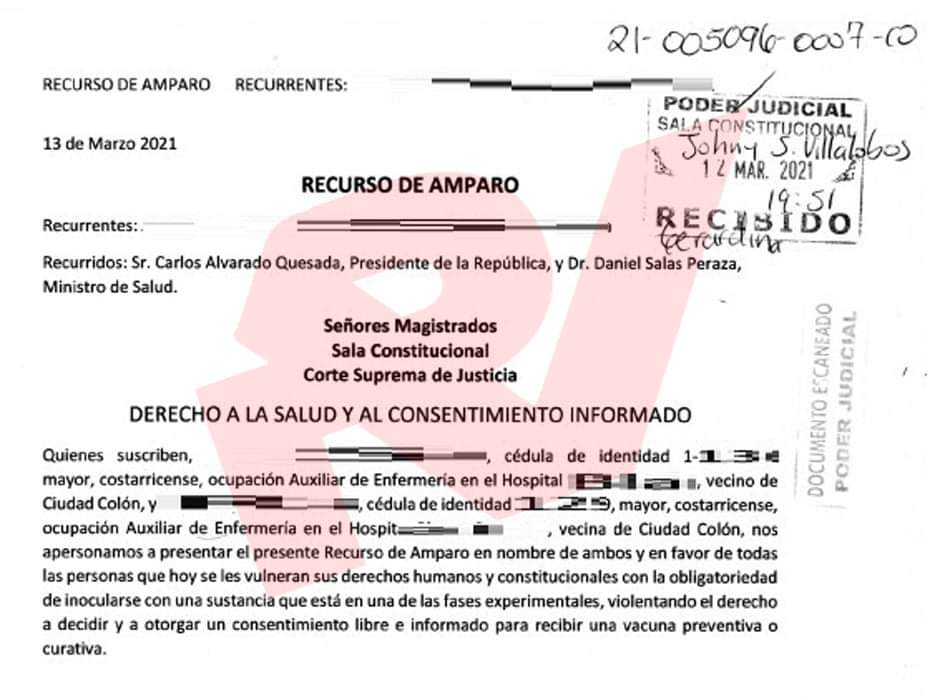 Como les adelantamos hoy en la tarde… hace unos minutos un numeroso grupo de costarricenses muy comprometidos y preocupados por la situación actual, (entre los que iban médicos, enfermeros y demás trabajadores del sistema de salud), acudimos a la sala constitucional para presentar un recurso de amparo colectivo contra el presidente de la República y el ministro de salud, quienes consideramos que incurrieron en un delito al decretar obligatoriedad de la aplicación de la VAK_KUNNA a esa población.