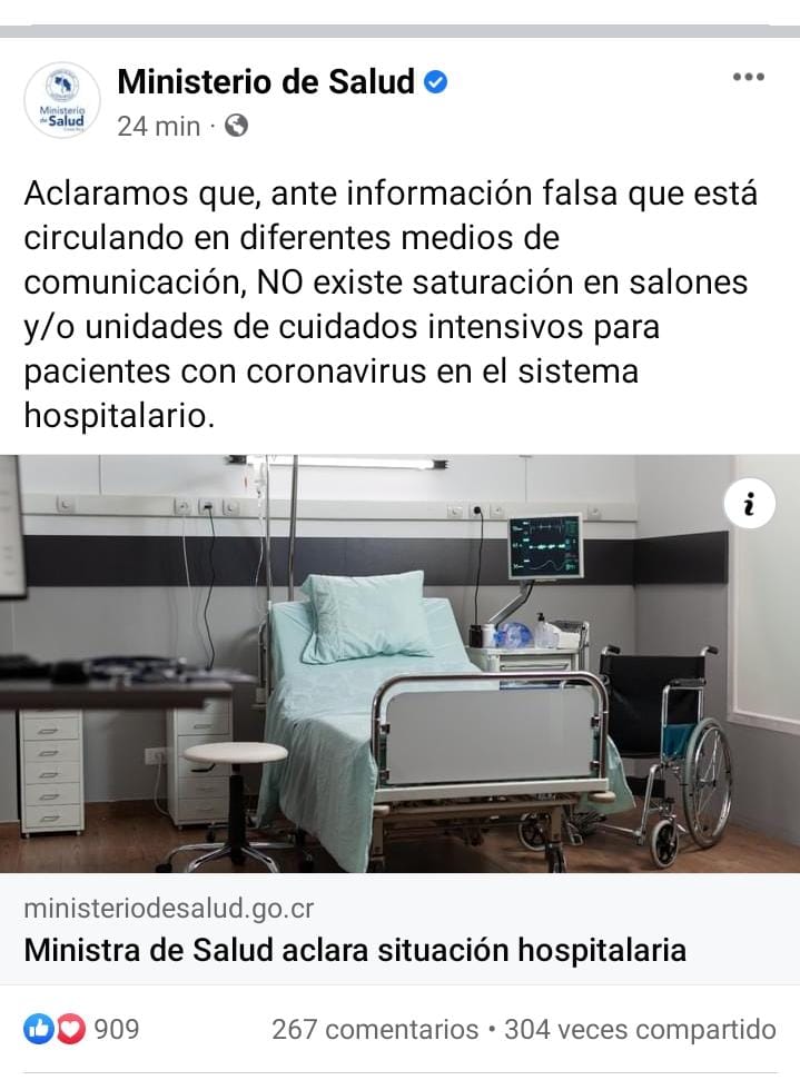 Ministerio de Salud desmiente saturación hospitalaria por COVID-19El Ministerio de Salud aclaró que, ante información falsa que está circulando en diferentes medios de comunicación, no existe saturación en salones y/o unidades de cuidados intensivos para pacientes con coronavirus en el sistema hospitalario.«Solicitamos a los medios de comunicación evitar publicar este tipo de mensajes, cuyo único … Sigue leyendo Ministerio de salud desmiente saturación hospitalaria por Covid-19