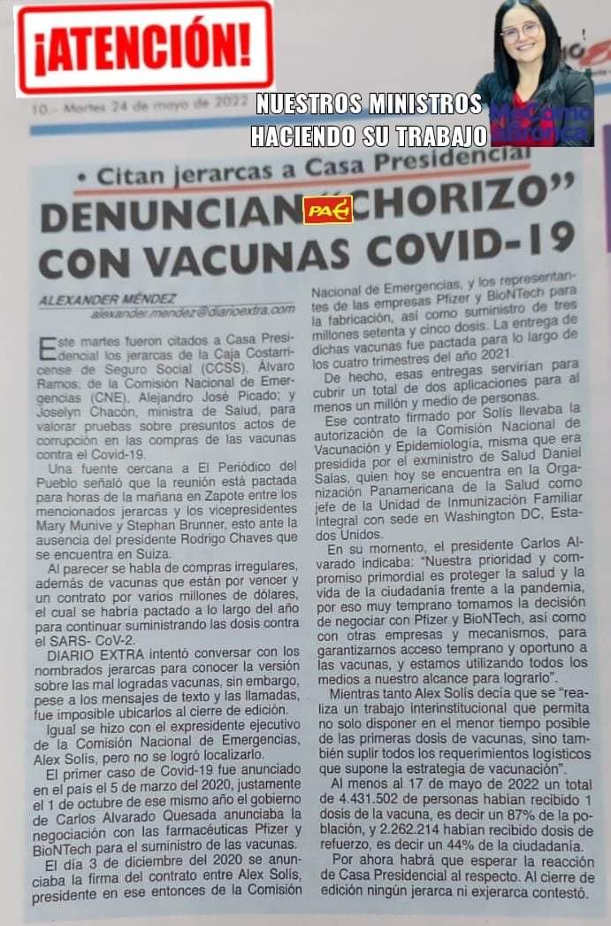 Reunion en Zapote entre los jerarcas y los vicepresidentes Mary Munive y Stephan Brunner, esto ante la ausencia del presidente Rodrigo Chaves que se encuentra en Suiza.Al parecer se habla de compras irregulares, además de vacunas que están por vencer y un contrato por varios millones de dólares, el cual se habría pactado a lo … Sigue leyendo Chorizo en compra de vacunas Covid-19