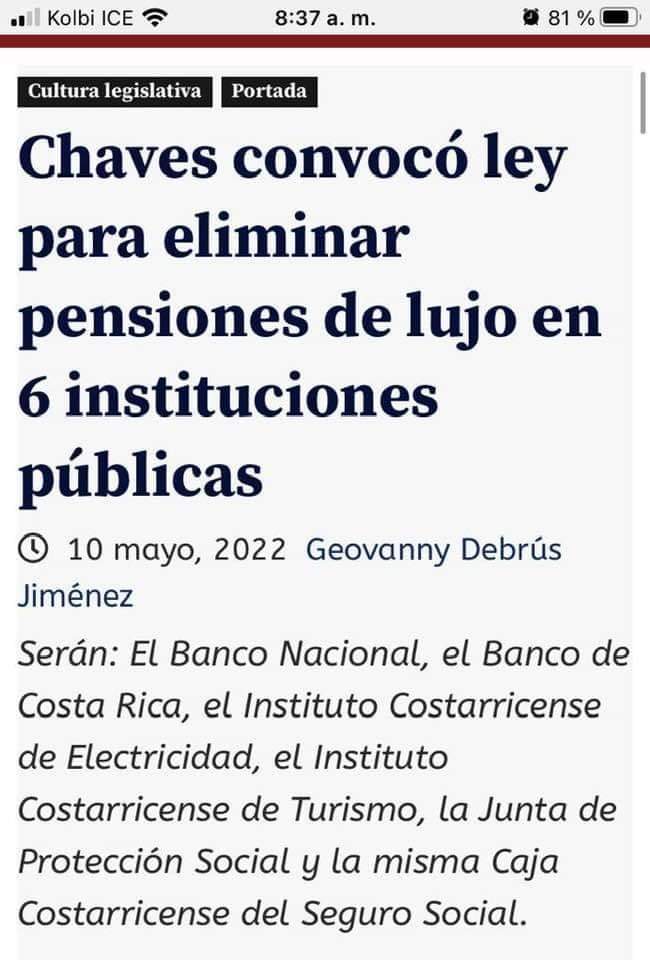 LAS COSAS COMO SON ...en 3 dias el PRESIDENTE RODRIGO CHAVES , le ha movido el "suelo" a mas de uno ....En resumen, este proyecto eliminará las pensiones abusivas para funcionarios de 6 instituciones públicas: el Banco Nacional, el Banco de Costa Rica, el Instituto Costarricense de Electricidad, el Instituto Costarricense de Turismo, la Junta … Sigue leyendo En 3 dias el PRESIDENTE RODRIGO CHAVES , le ha movido el «suelo» a mas de uno