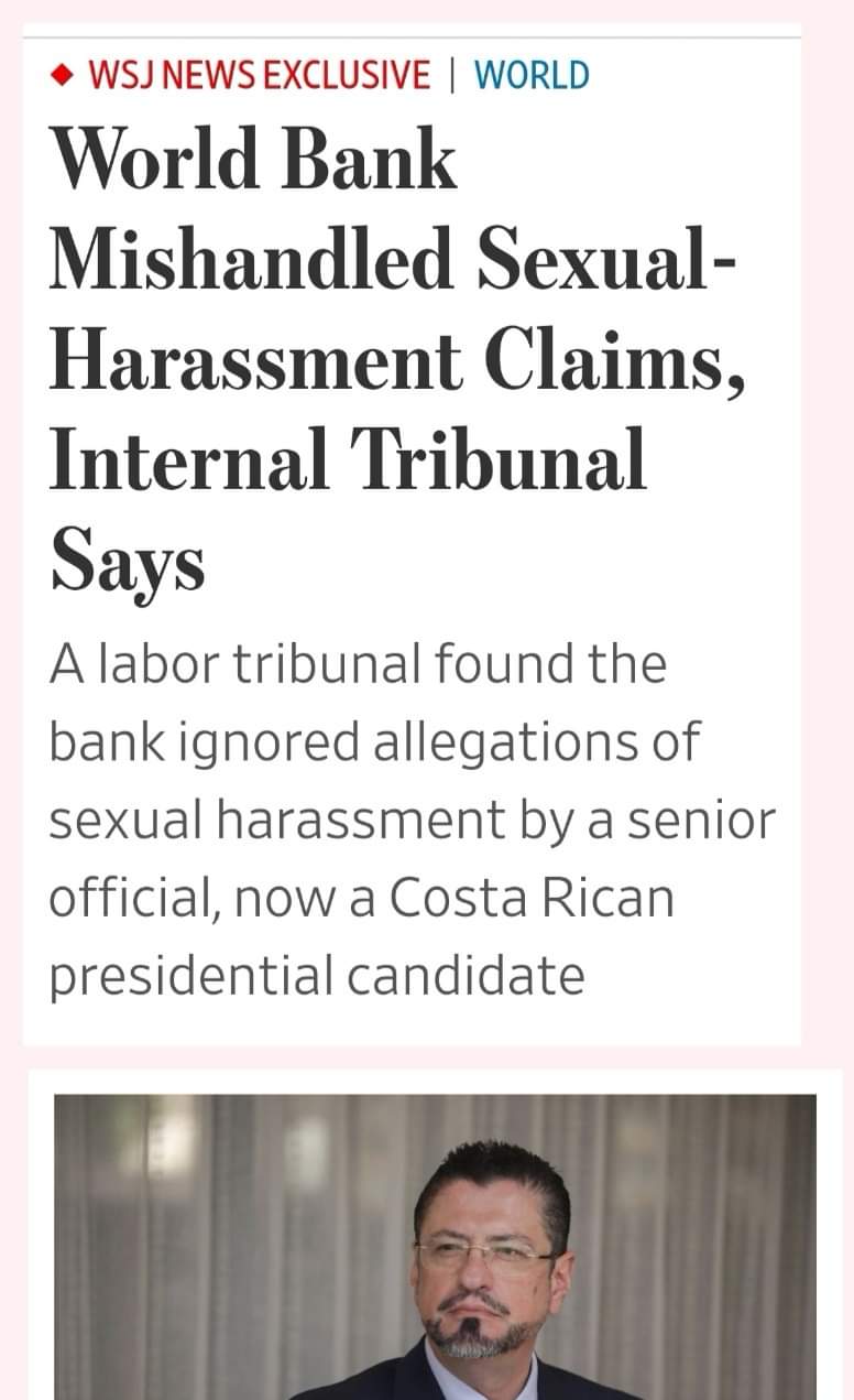 ***Este artículo en The Wall Street Journal acerca del caso del candidato presidencial Rodrigo Chávez está bien interesante, del mismo anoto algunos párrafos:El Banco Mundial manejó incorrectamente las denuncias de acoso sexual... Un tribunal laboral determinó que el banco ignoró las acusaciones de acoso sexual por parte de un alto funcionario, ahora candidato a la … Sigue leyendo El Banco Mundial manejó incorrectamente las denuncias de acoso sexual en contra de Rodrigo Chavez