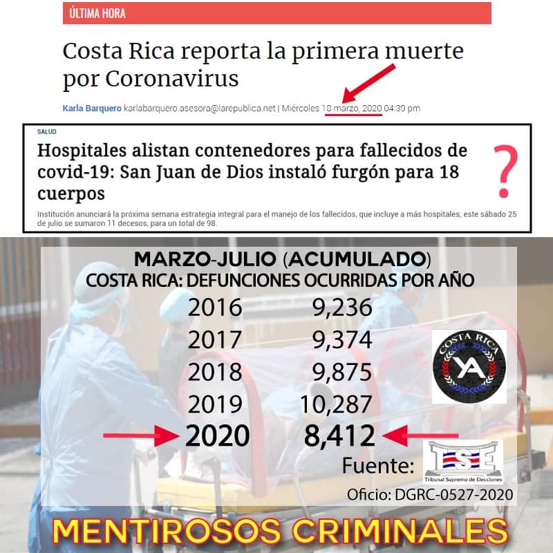 Analicemos lo siguiente…y comparta para que todo el mundo se entere...*-*-*-*-*-*-*-*-*-*-*-*-*-*Desde hace algún tiempo #CostaRicaYa solicitó los datos globales de muertes desde el año 2016 y vaya sorpresa, porque si observas el cuadro comparativo adjunto de los meses de MARZO a JULIO de cada año analizado, notamos que este 2020 se han dado menos muertes … Sigue leyendo Analicemos lo siguiente…y comparta para que todo el mundo se entere…